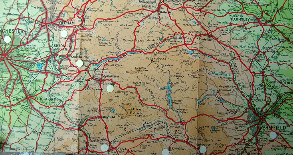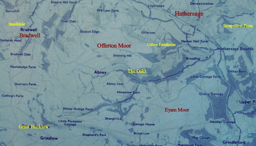 Sophia’s wanderings: Hathersage and Scraper Low first dot left of Sheffield (bottom right corner); Bradwell where she ended her days next dot left from Hathersage; third dot left of Sheffield is Chinley where John Brocklehurst farmed; Glossop where they married due north of Chinley; Stalybridge, Mossley, Manchester across the moors northwest of Glossop.
