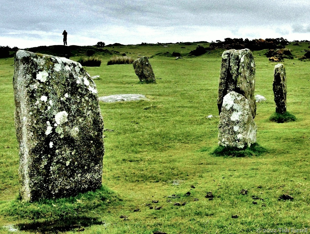 Below the Cheesewring we step back into the remnants of a prehistoric landscape: three Neolithic stone circles called the Hurlers. But as to that figure apparently hovering on the horizon – who knows what time stratum he belongs to.