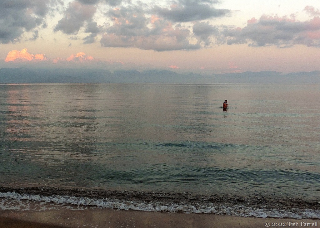 Another ‘still waters’ scene. An end-of-summer sunset in Kalamata. I watch a naked man wade into the rose-tinted shallows of the Messenian Gulf, talking on his cell phone.