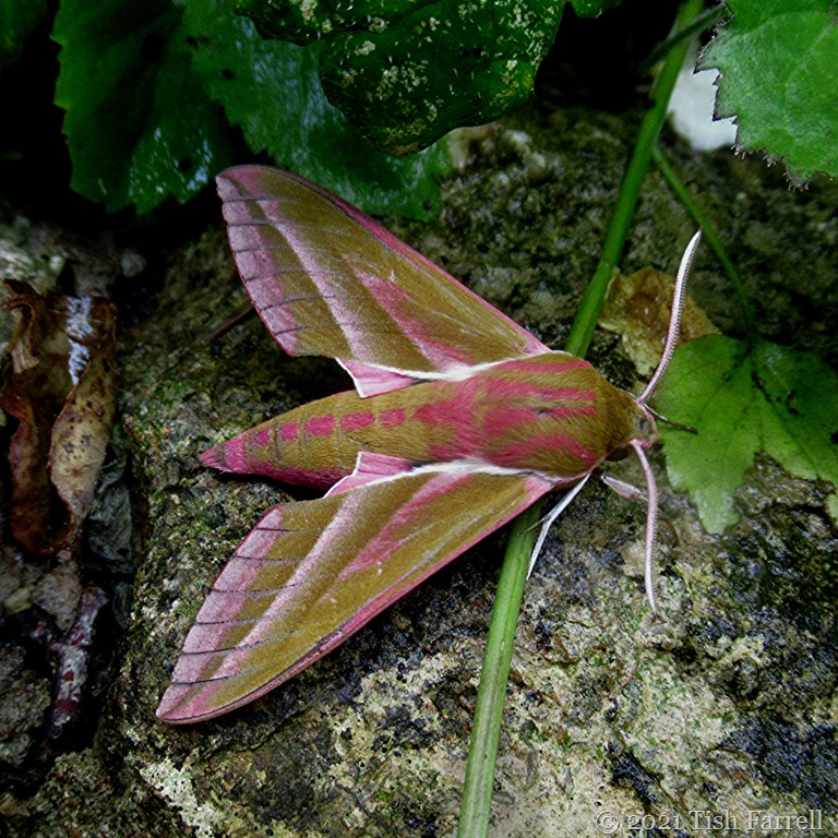 I thought my photo of an Elephant hawk-moth, Deilephila elpenor, deserved another viewing, being both unusually pink (as for Jude’s Life in Colour this week) and bright lipstick pink and so good for a Becky-bright-square. The moth itself  was a surprise arrival on the garden wall a couple of summers ago. In fact I think it was asleep when I found it. In real life it was about 6 centimetres across (2 and a half inches); a big moth, in other words. And in its caterpillar form it is even bigger, though at that stage it is mostly a dull sludgy colour with pink eye spots and a strange little horn on its tail end.