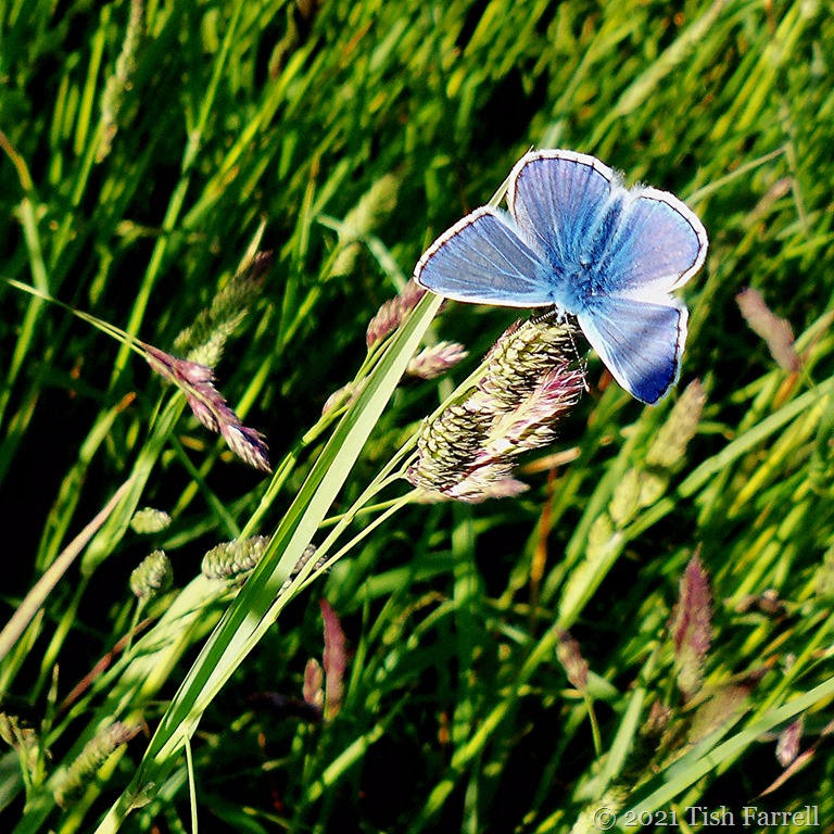 A male Common Blue butterfly (Polyommatus icarus ), spotted one summer’s evening on my way home from the allotment. And despite the name, these butterflies are not at all common in our corner of Shropshire. Not only that, if you do happen to see one they don’t usually stay to have their photo taken. A very lucky shot then. And even in this next more distant view, still a magical sight:
