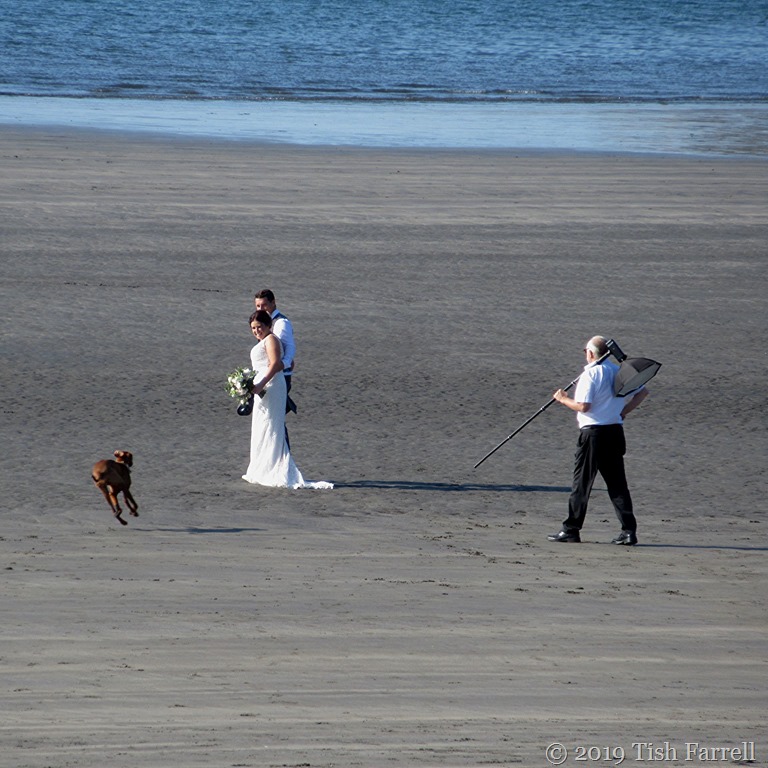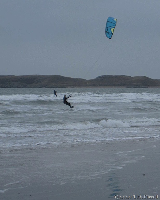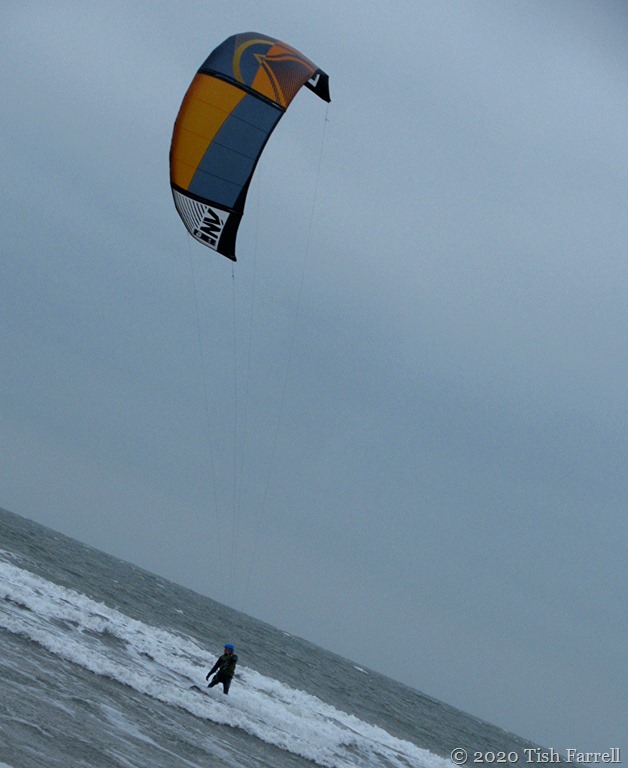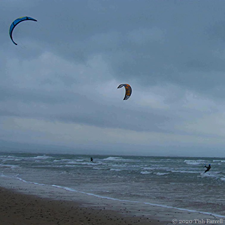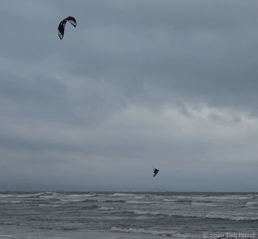 But down above the tide-line there is much activity – lines laid out and out across the sand as paragliding wings are prepared by dive-suited individuals. Much clicking on of harnesses, clapping on of helmets and multi-coloured kite-fluttering. And then they are off, skimming the bay at astonishing speeds, now and then shooting high above the surf – aerial ski-jumping. It is exhilarating to behold – or it is when one can focus through eyes filled with wind-tears. But then that’s one of the things we love about this beach – you just never know what you will see there.