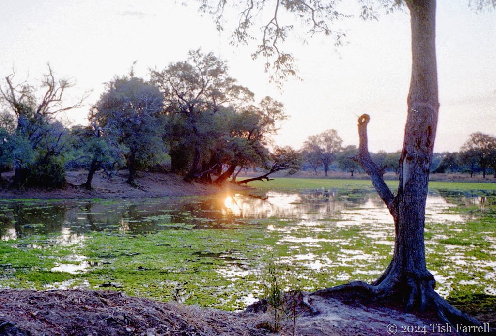 The Farrell tent is under a Sausage Tree (Kigelia africana), a stone’s throw from the shelving river bank and within close hearing of much hippo grunting. We’re served tea and cake and told to take a siesta until late afternoon. At sunset we’re back in the truck, and being driven to one of the lagoons, where we stop for sundowner drinks and to watch for any wildlife. Our fellow guests, along with Dutch couple, are Jo Pope’s parents. The foursome are old friends. It feels like a family party, and again there is much noisy chatter. But then the light in lagoons is so breath-taking, it’s hard to be too irritable. Instead, as I watch a flight of Sacred Ibis on a tangerine sky, I long for a camera with rather more range than my little Olympus-trip.