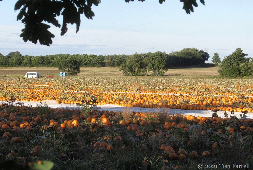 Warwickshire is largely an agricultural county, mostly arable with ‘big-field’ cultivation and wooded peripheries, the surviving 18th century (and older) farmhouses displaying well kempt manorial looks. By late September the harvest was pretty much done, the drilling of winter wheat underway. What remained, though, were fields and fields of pumpkins, they of the now customary Halloween variety. In fact there were so many acres of them – Sleepy Hollow on agristeroids – we decided the farmers must be growing them under contract to every big supermarket chain across the land. Who knew? But we pitied the poor pickers who we saw arriving on gathering duty: some of the pumpkins were HUGE, not easy to grapple with.