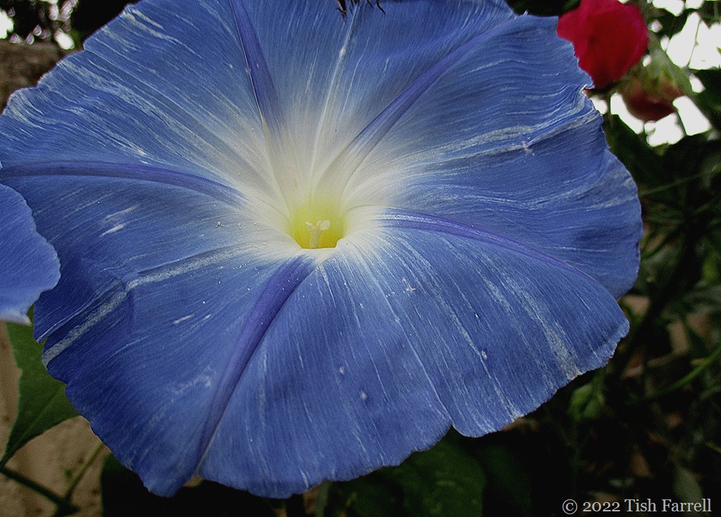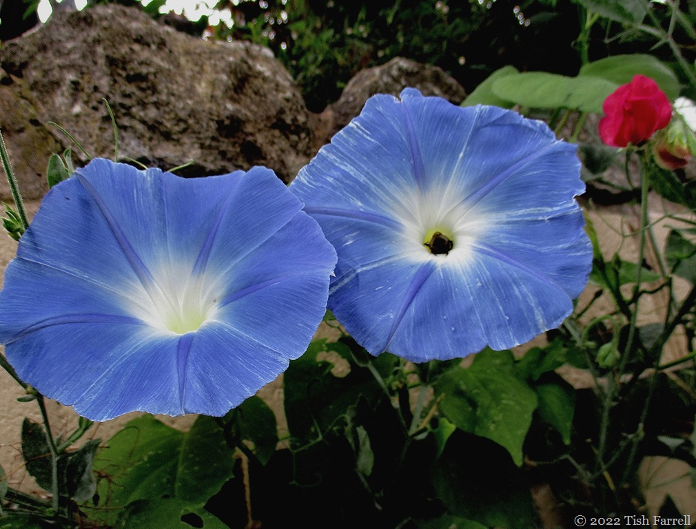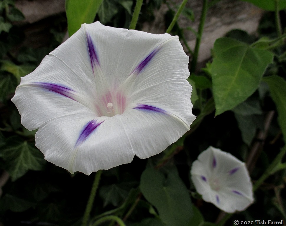 Thank goodness. Our second day of COOL, with a good 10 degrees C completely vanished in thin air. It’s back to grey skies too. They often feature in British summers, and for once we’re thankful. The Morning Glories seem to feel the same way. There were eight blooms out this morning: four Flying Saucers with the sweet peas on the downstairs terrace, and some white ones with purple flashes among the Sun Gold tomatoes in the upstairs garden. They don’t last long though, even without the blazing sun curling their petals.