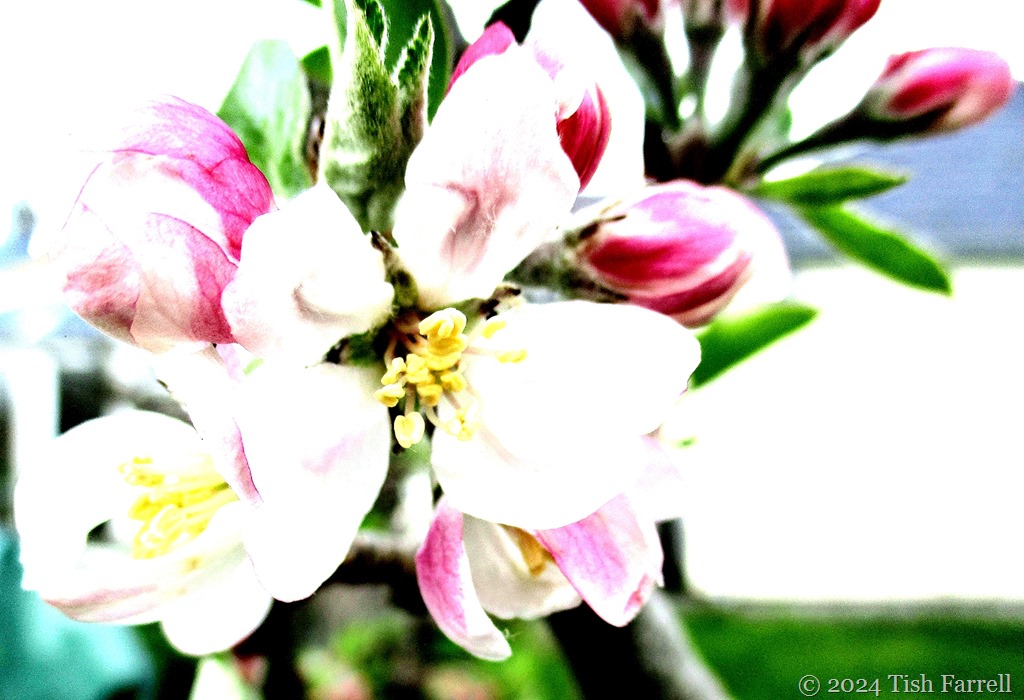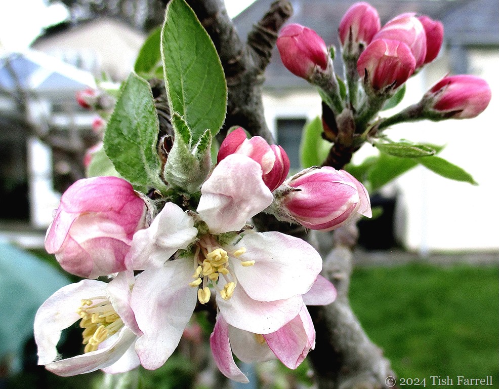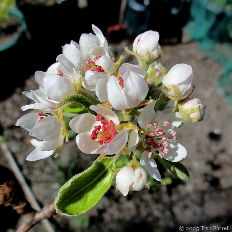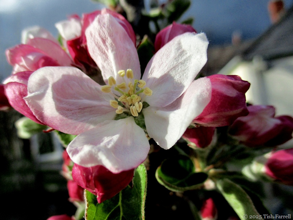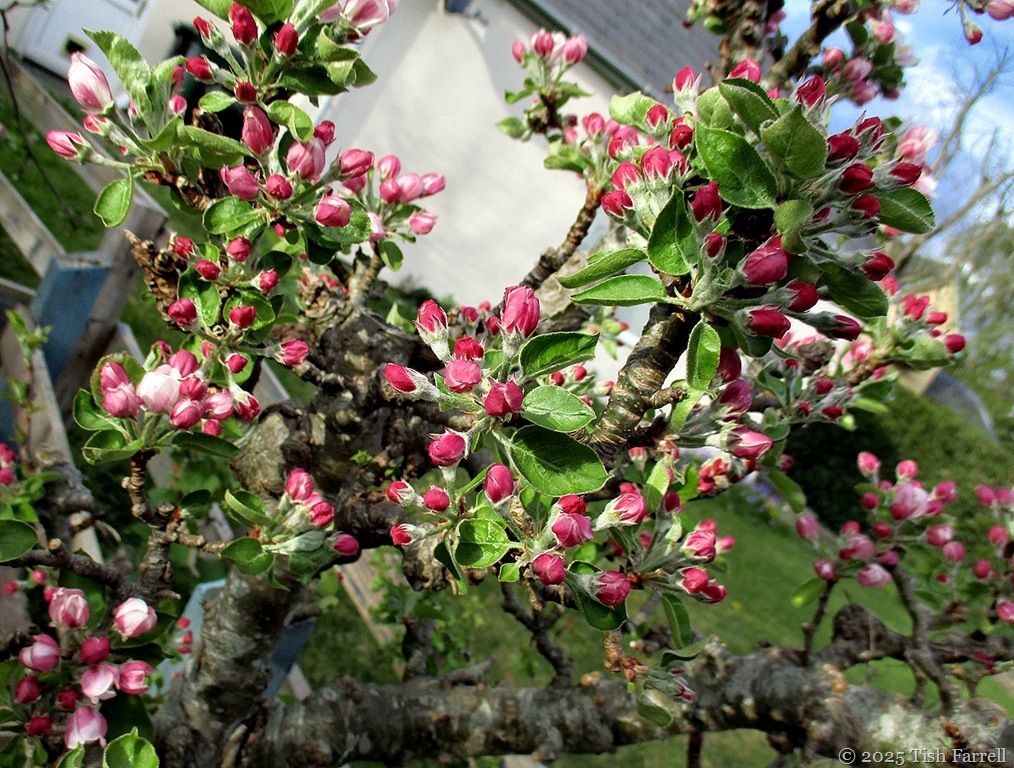 In the garden, spring is happening despite the perishing wind. Our gnarled little apple tree by the compost bin has dared to open three buds, but you can tell they’re shivering. I think it’s a Crispin. We had a few good apples from it last year. The other two apple trees that came with the garden, had to be hard pruned, as in eight feet of  top growth removed, so we’re not expecting much from them for a while.