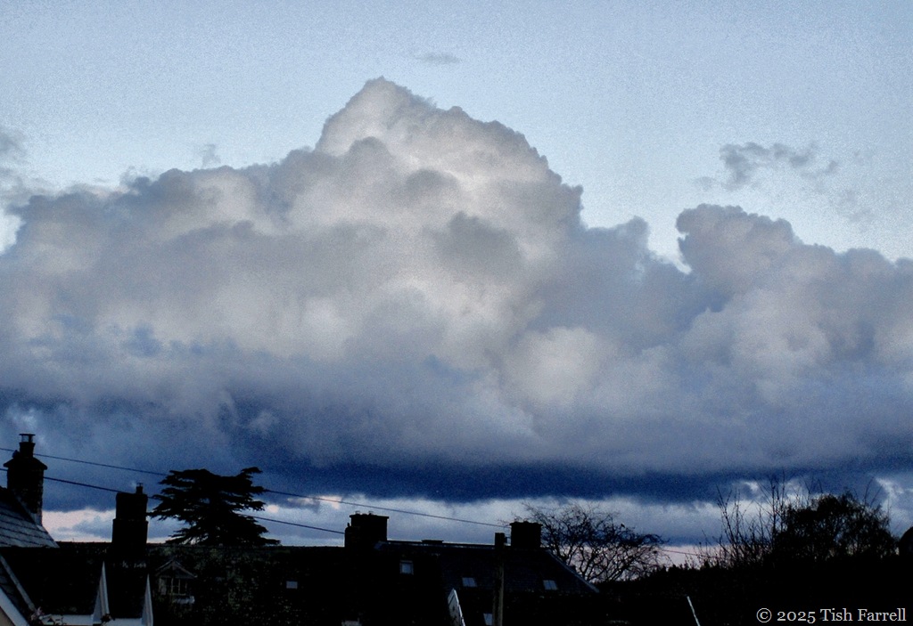 Over the garden fence this afternoon. And yes, after weeks of drought, we’ve had some rain, though the showers have not been as generous as these clouds seem to promise. I watched them roll out across Townsend Meadow towards Wenlock Edge. A cloud serpent, or a Chinese dragon in many shades of grey. There were pigeons flying every which way and some horizontal lightning.