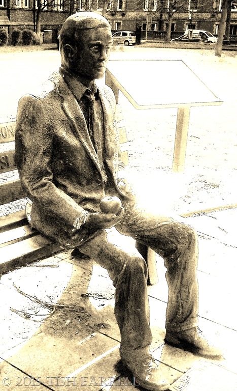Over at Travel Words, Jude’s October Bench series calls for shots of benches with someone or something on them. This reminded me that I hadn’t posted these photographs of the Alan Turing Memorial, taken on a bright and early April morning in Manchester. I like the way someone has placed a cherry blossom behind his ear – symbolic perhaps, but affectionate too. I feel that if he had been alive now, living in world that is rather more enlightened about sexual mores, he would have enjoyed the gesture.