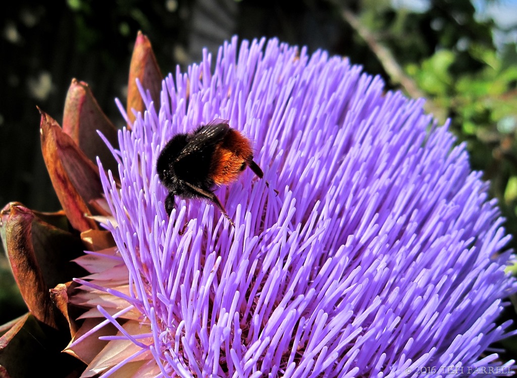 Up at the allotment the globe artichokes we did not eat earlier in the summer are flowering, and the Red-tailed Bumblebees think all their breakfasts have come at once. In fact they’re trying to scoff them all at once too. The flower, after all, is a VERY BIG thistle. This makes me wonder if the huge expanse of ultra-violet attractant doesn’t over-stimulate the foraging impulse, thus explaining the manic bee rootling  that has them scrabbling, bottoms up, through the petal forest to reach the sweet stuff beneath.