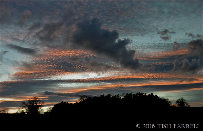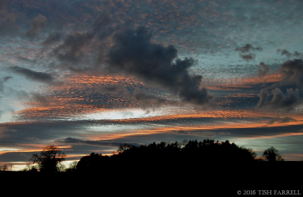 Hard to know which of us was on mind altering substances – me, my camera, or the Wenlock Edge Sky-painter. Perhaps all three of us. Anyway, I was tramping along the margins of Townsend Meadow, having been to the allotment for a trawl of Tuscan kale and cabbage tree greens. It was around 4 p.m. but already going dark, and I had paused briefly to watch three little girls bouncing so joyously on their garden trampoline in a hectic communion of after-school-steam-lettingoffness – when it suddenly occurred to me to turn around. And this is what I saw. It took my breath away. So of course I had to snap it and pass it on.