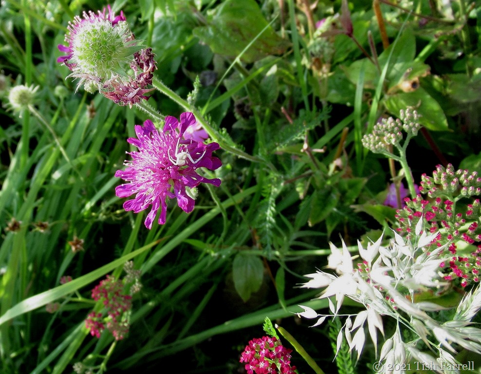 Then out in the guerrilla garden, the knautia keeps on flowering and is now providing a hunting ground for a tiny crab spider: