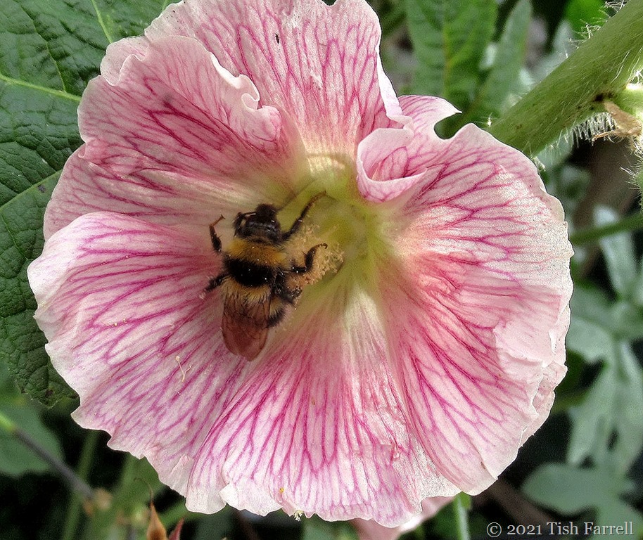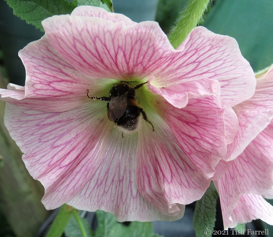 Meanwhile out in the garden the bees aren’t letting the weather affect the feeding imperative. The hollyhock flowers have been a particular favourite, the bees calling in for an all-over pollen wash.