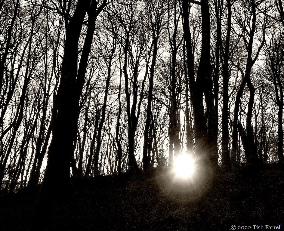This photo was taken one Christmas afternoon on the lane to Penmon Point on the island of Ynys Mon (Anglesey). The view is of the North Wales mainland across the Menai Straits. These extraordinary light shows over the water are a local feature, and so I tell myself that it’s not surprising that the island was the Druids’ last stronghold in the face of the Roman invasion, or that early Christian hermits settled here. (See Island of Old Ghosts.