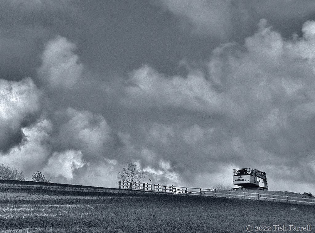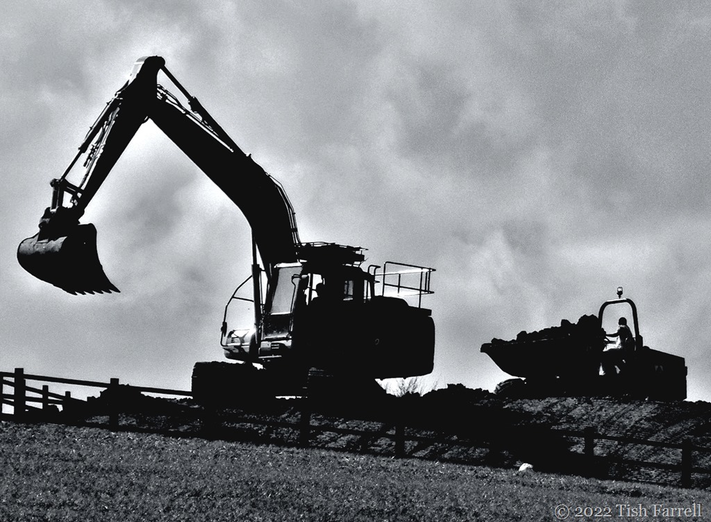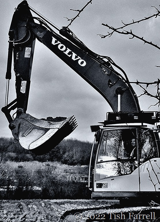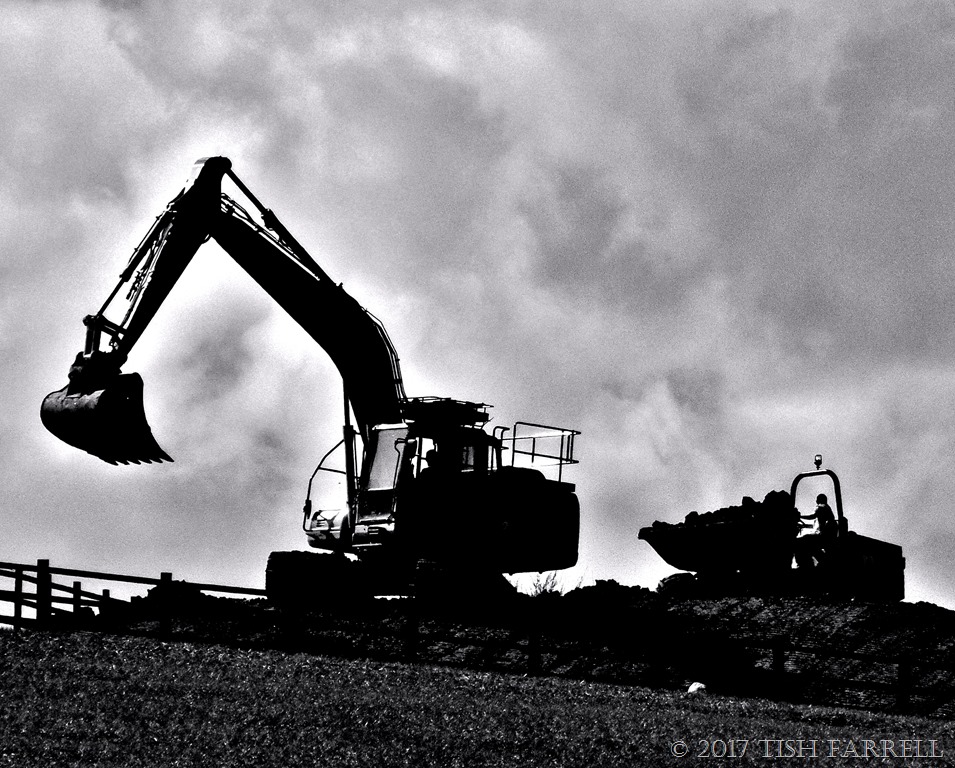 Much time can pass at these windows, studying cloud movements or the wheeling of rooks and jackdaws. Sometimes the odd soul (with or without companionable dog) walks by on the field path just beyond our garden gate, and sometimes on Monday mornings, the town’s entire ‘walk for health’ mob, several dozen strong with high-vis vested leaders and bringers-up of rear, trails by. Now and then, too, the farmer can also be spotted, driving his latest substance-spraying rig back and forth across the crop (this week it was a top-dressing of fertiliser for the wheat which – after the rain – is already shooting up like multiples of Jack’s beanstalk). So given this general lack of activity out back, the appearance of a big digger and very large dump truck on the near horizon was an exciting event.