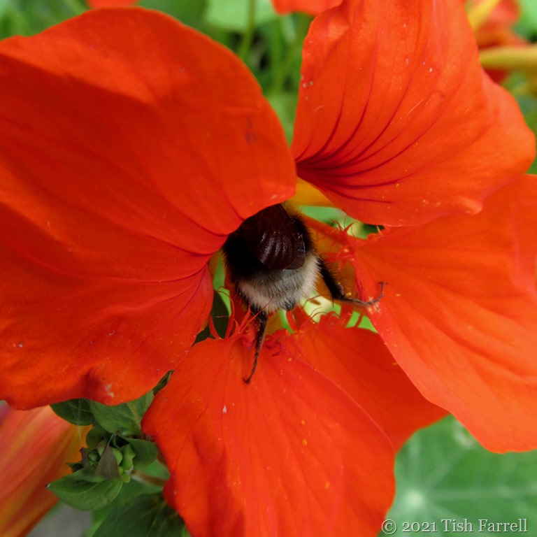 Today, Jude at Travel Words wants to see examples of edible orange. And just in case you think that only the bumble bees are enjoying my allotment nasturtiums, I have to confess I’ve lately been chomping the flowers whenever I go gardening. At the moment there’s a huge flock of them on the bed where I had broad beans earlier this summer. I’ve no idea how they got there (interspersed with pot marigolds) but they are making a colourful show, and their late arrival (seasonally speaking) means they have escaped depredations from cabbage white caterpillars and aphids.