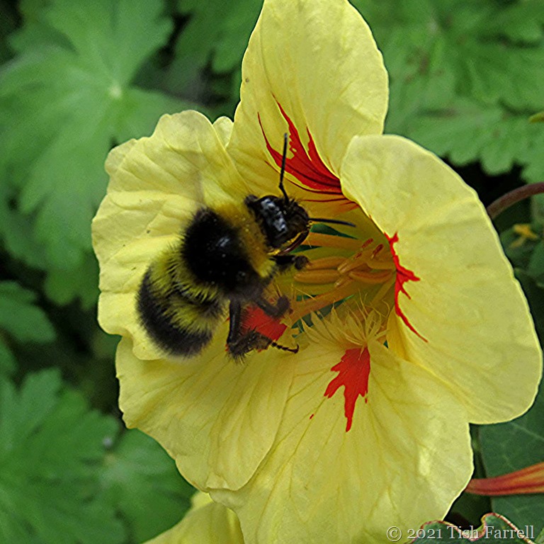 The leaves are huge and the flowers are wonderful. Bumbles, honey bees, beetles and hoverflies think so too. They are currently getting drunk, shoving their way into the male flowers, and drilling down into the nectar below the stamens. In the process they are bathed in pollen. They can’t seem to get enough nectar and don’t care how many of them squash in there, or if they are different species.