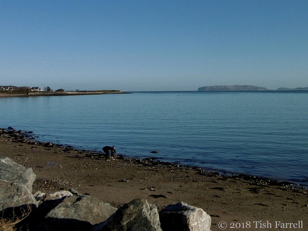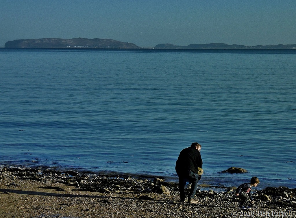 We have spent several Christmases on the island of Ynys Mon, otherwise known by its Viking name of Anglesey, in North Wales. The weather in December always throws up surprises. On our last trip this was one of them – a perfect, windless, cloudless day with warm sunshine. We wandered on the Menai Straits beach, looking out at the Great Orme peninsula at Llandudno across the water. I found myself watching this young man and his little  boy, so absorbed in their play, the sun catching winter-white faces. No sound but the call of an oyster catcher.