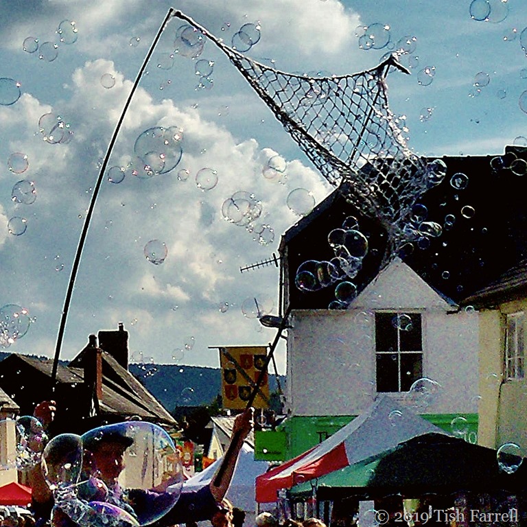I have never grown out of loving bubbles. As a rural child of the fifties receiving a tin of them complete with a pretty little plastic wand (pale pink or blue) was one of life’s big thrills. And so rather more recently when we came upon the Bubble-Making Man at Bishops Castle Michaelmas Fair it was all I could do to stop myself from joining in with the children’s great bubble chase. Because that’s what you do with bubbles – you try to catch and keep them. You want just one of them to last forever and ever. Anyway, being several decades beyond childhood, I contained my excitement by snapping them instead. Which of course means I do get to keep them. And you get to have them too. And if you’re having a so-so Monday, or even a dreary one, here’s a gift of bubbles to lift the spirits. Who’d’ve thought there was so much magic in a bucket of soapy water and a piece of net. Just goes to show!