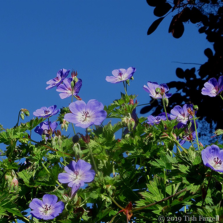 One of the best things about a garden on several levels is that you get to see plants  from unexpected view points. Here’s Rozanne busy flowering her socks off. She’s on top of the wall that holds up the bank behind the house, well above my head height,  and will be flowering now until the first frosts. The almost black foliage in the corner is Cotinus aka Smoke Bush or Smoke Tree. When it flowers it is a mass of feathery creamy-pink plumes.