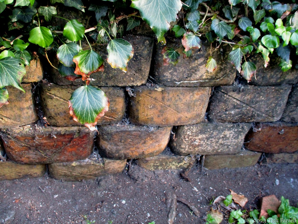 At the foot of this hill is Gough’s Jitty, that runs crosswise, left and right to Crew’s Park. We turned left and soon came upon the very noteworthy retaining wall built entirely of saggars. These are fireclay boxes, the remnants from one of Broseley’s clay tobacco pipe factories.