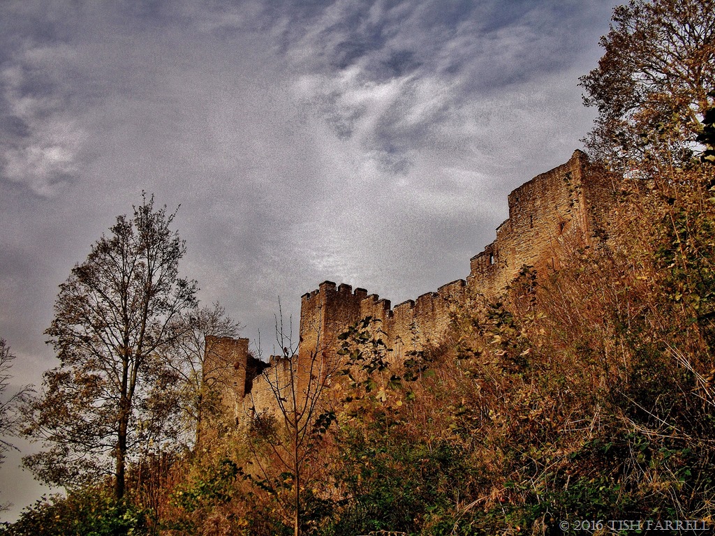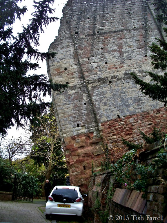 The outer bailey walls extended to the top of today’sHigh Street. See the next photo. If you home in on the on-coming red car below the brown building facing downhill, you’ll be in roughly the right spot.