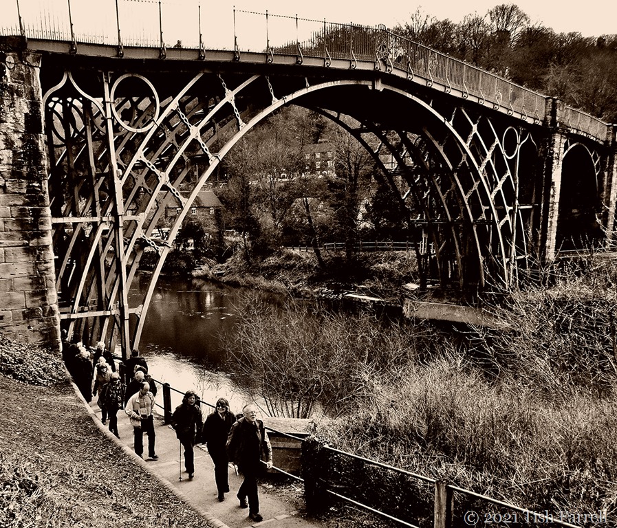 Upstream of the bridge we find a band of happy industrial architecture enthusiasts. They have just enjoyed a spirited ‘Iron Bridge’ talk from the late John Powell, for many years librarian at the Ironbridge Gorge Museum Trust,  and seen here leading the group onwards to other exciting Severn Gorge sights.