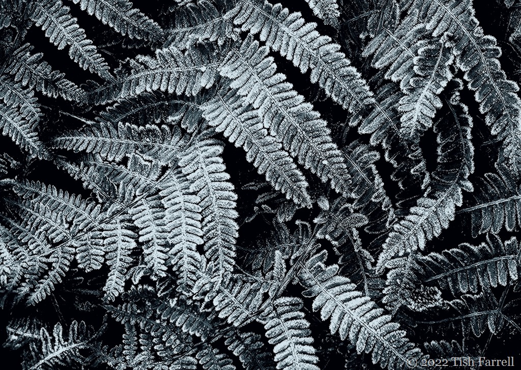 For anyone currently suffering any kind of over-heating, herewith some cooling images of frosted ferns. These photos were taken a few Decembers ago during a sudden frigid spell in Hay-on-Wye, widely known as the book capitol of the world. We’d planned a long weekend there – a brief trip out of Shropshire and into Powys. It was only an hour or so’s drive. Up to the moment we set off, we’d had mild winter weather, but even as we stopped for a cup of tea half way in scenic Eardisland, we could feel the bank of cold, cold air closing in.