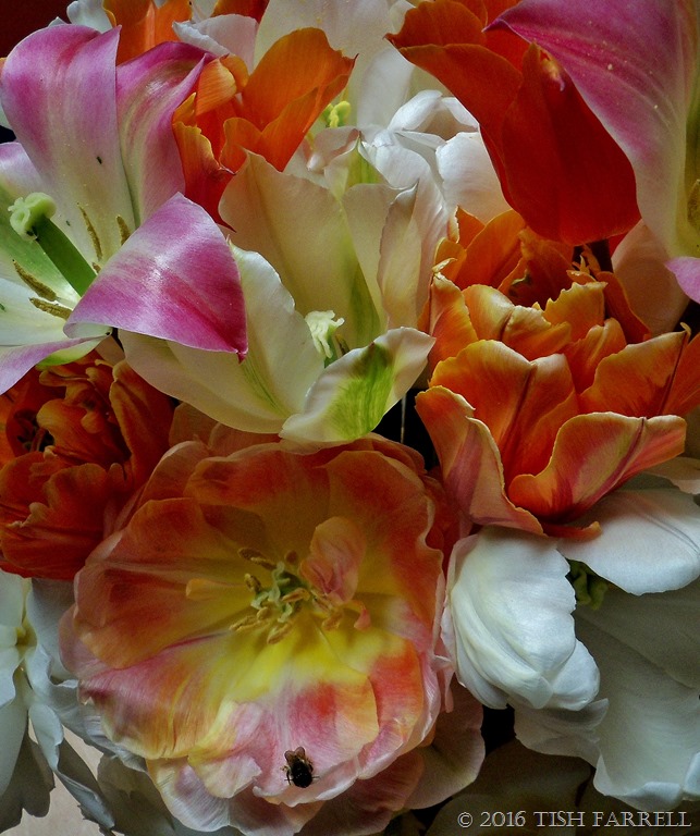 I can see why 17th century Dutch merchants worked themselves into a fever over tulip bulbs. The flowers are never static. Even when captured in a vase they change shape and shade throughout the day. I think the colours here complement Cee’s stunning bearded iris, so please visit her at: