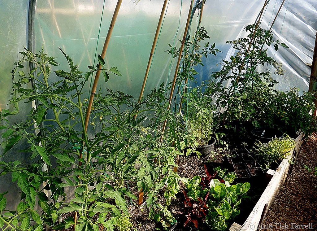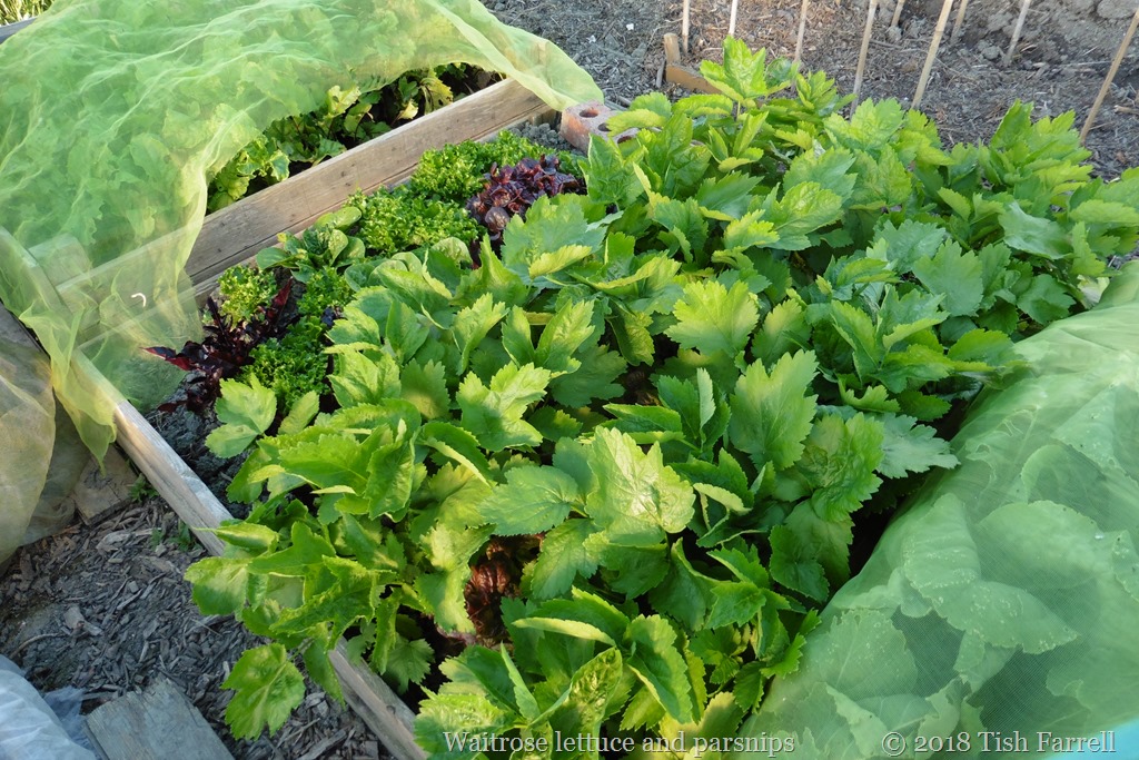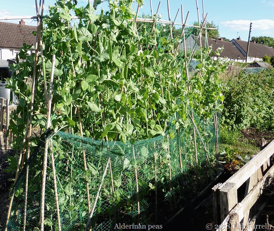 Climbing peas Lord Leicester and Alderman bringing up the rear; Belle de Fontenay potatoes centre; in the raised beds: seedling clumps of perennial leeks (Russian variety), kohlrabi and cabbage left foreground, and a rather poor showing of parsnips to the right.