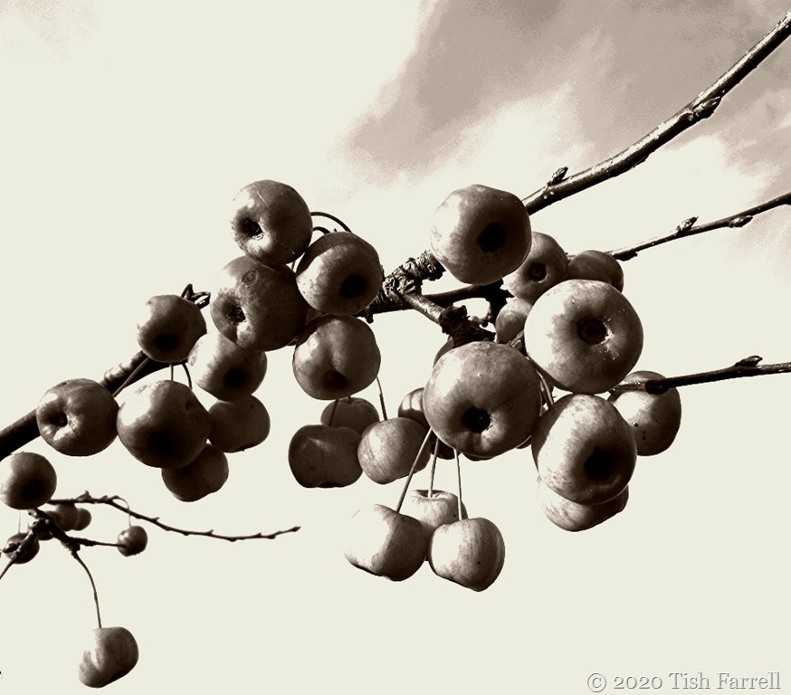 I’m in love with the Japanese crab apple tree in my garden at Sheinton Street. There is hardly a moment in the year when it does not give pleasure. Even now in February there are still a few tiny apples on its bare branches – minimally disposed like a left over Christmas tree that someone forgot to undress. The black bird still visits, although by now the apples have been frosted and lost their bloom.