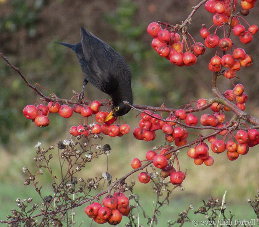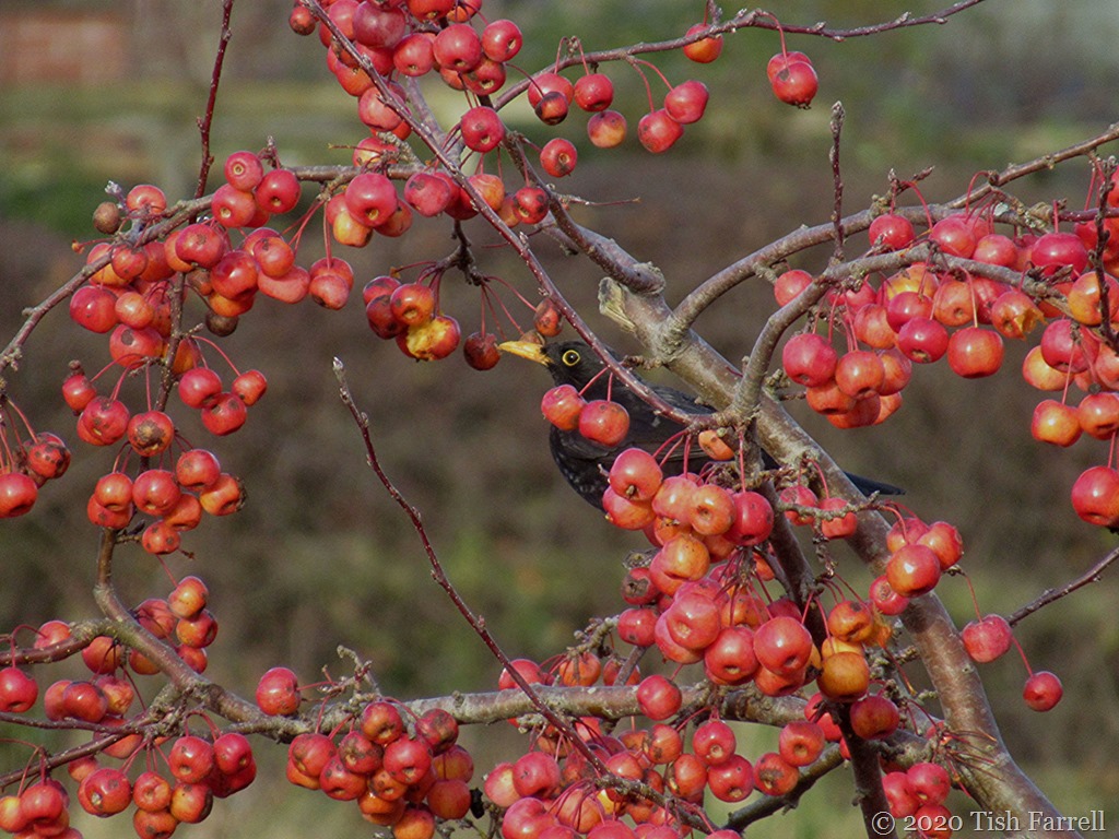 For the last couple of days this male blackbird has been tucking into our garden crab apples. He has a technique. Using his beak like a dagger, he jabs downwards with great vigour, slicing off morsels. Sometimes, though, he ends up with a mouthful he cannot swallow, which then requires a descent to the garden path where sets about cutting the apple down to size. All part of the morning’s seasonal entertainment at the Farrell establishment.