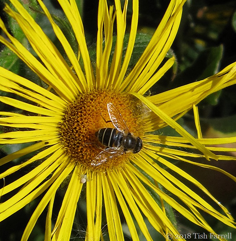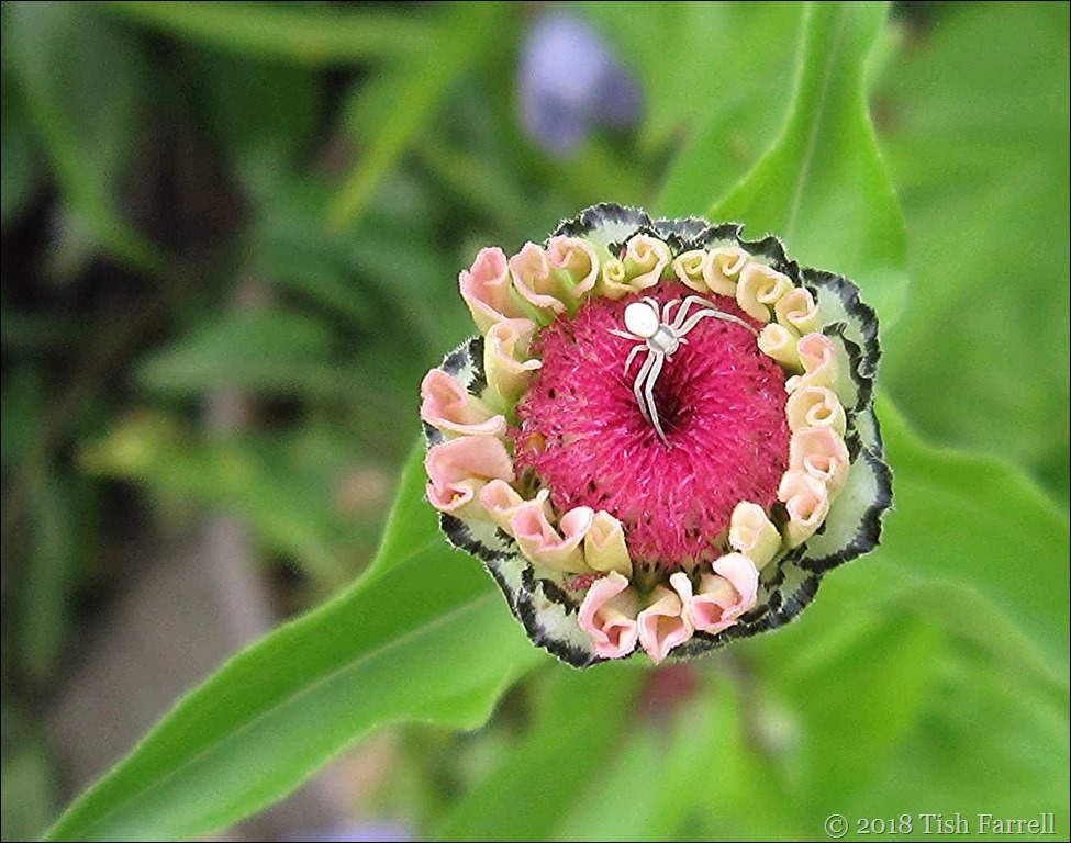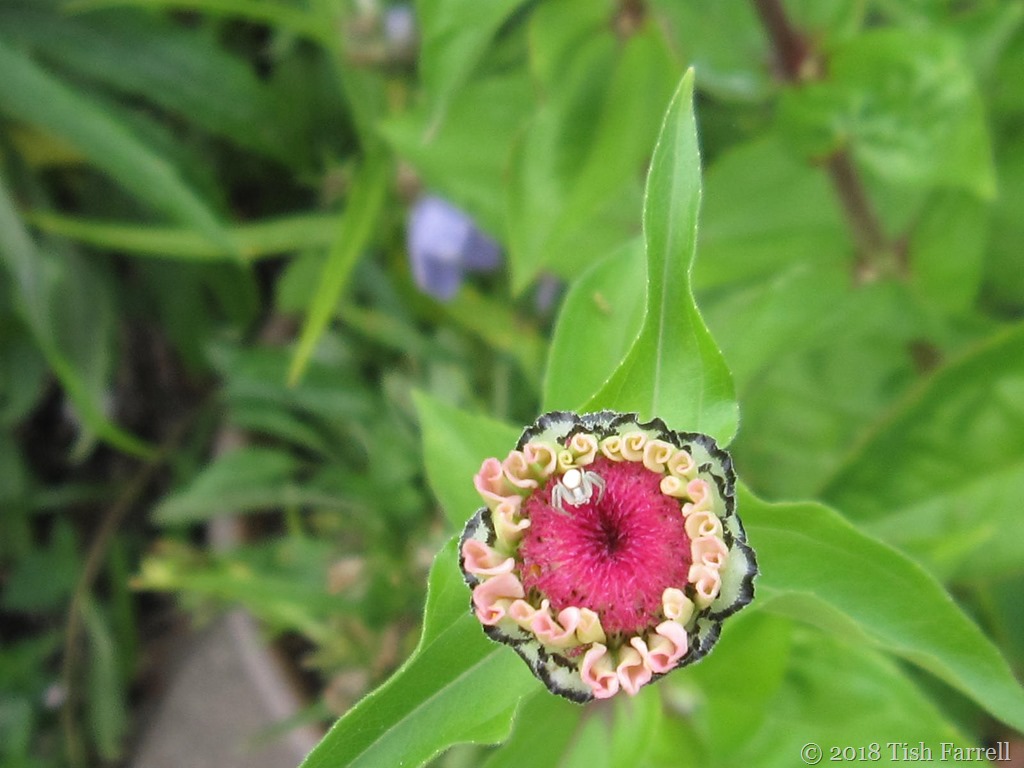 This tiny crab spider has been zoomed to giant size in the photo. I guess, in real time, it was about 3 millimetres across, less than a quarter of an inch. And still it waved its little front legs at me (most crab-like in posture) when I tried to take its portrait. Next it went into hiding under the flower, and when I pursued it down the stem it flung itself at me and then disappeared into the flower bed. It was most unnerving to find oneself having ‘a relationship’ (albeit a fractious one) with such a teeny-weeny little arachnid; the suggestion of ‘intelligence’ even.