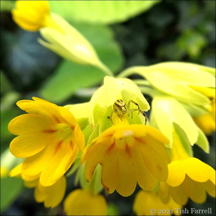 As you can see in the next photo, the flowers of this cultivated cowslip are anyway quite small. Feisty little critter, the crab spider.