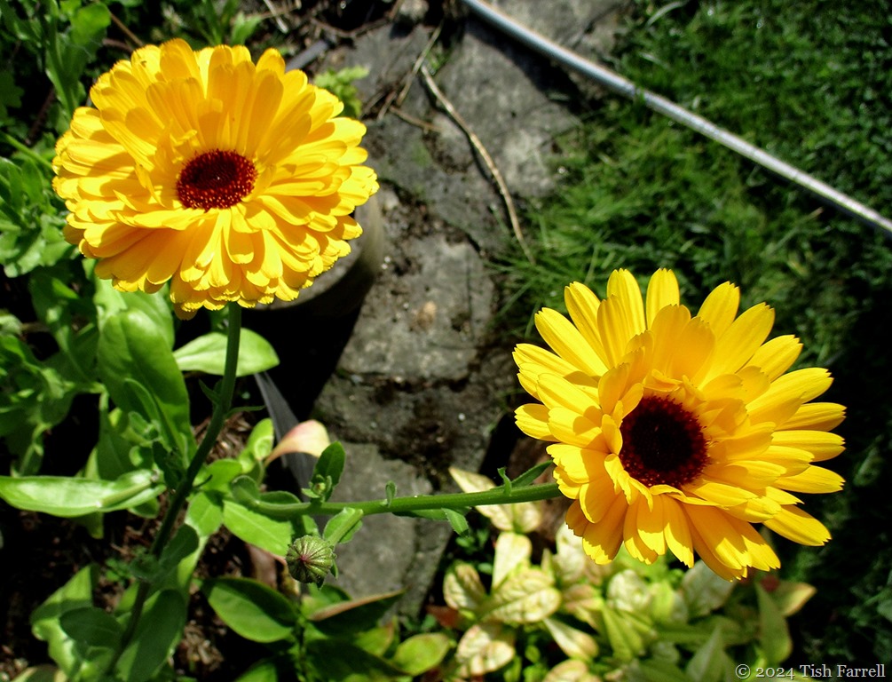 4: In the spring I’d sown some marigold (calendula) seeds, obtained from the Bishop’s Castle seed bank (local growers’ donations) and they’d germinated prolifically. So I planted them out all over the garden, front and back, because you can’t beat marigolds for their spirit-lifting qualities. And now we have masses of golden heads, which of course are edible too: