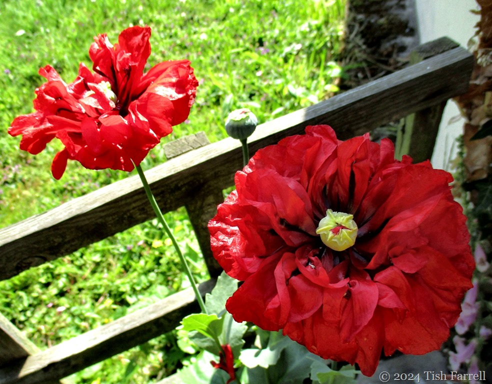 We have visitors, blown in from who knows where. All over the garden too. And what a show they’re giving us with their fiery frills and flounces. Papaver somniferum, the sleep-inducing opium poppy.