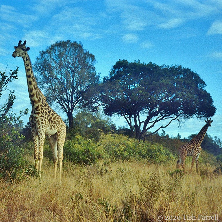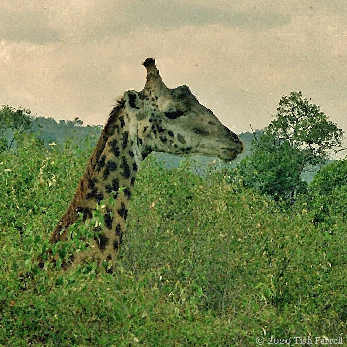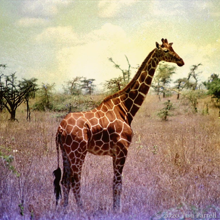The giraffe in the first photo is of the Masai variety, distinguished by the irregular ‘butterfly’ markings. Their main habitat range is Southern Kenya and Tanzania. To the north you find the Reticulated giraffe, slightly smaller, and darker in colour, and with those lovely blocky markings. They inhabit dry bush country and are even less dependent on water than their Masai cousins. This one was spotted on the Lewa Downs Conservancy in northern Kenya.