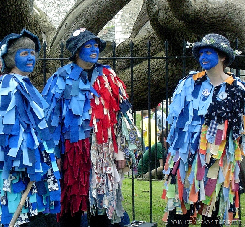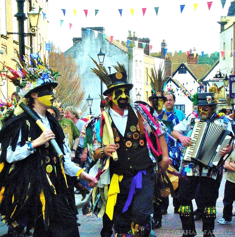 Welded onto all of this is the ancient English pastime of Morris Dancing, a form of folk dancing that has many regional expressions, and dates back to at least the 15th century. It had a great revival at the start of the 20th century when folklorists such as Cecil Sharp set about documenting traditional dancing and music. Below are some ‘traditional’ looking Morris Men. They are members of one of the sixty Morris bands that take part every year at the Sweeps’ Festival.