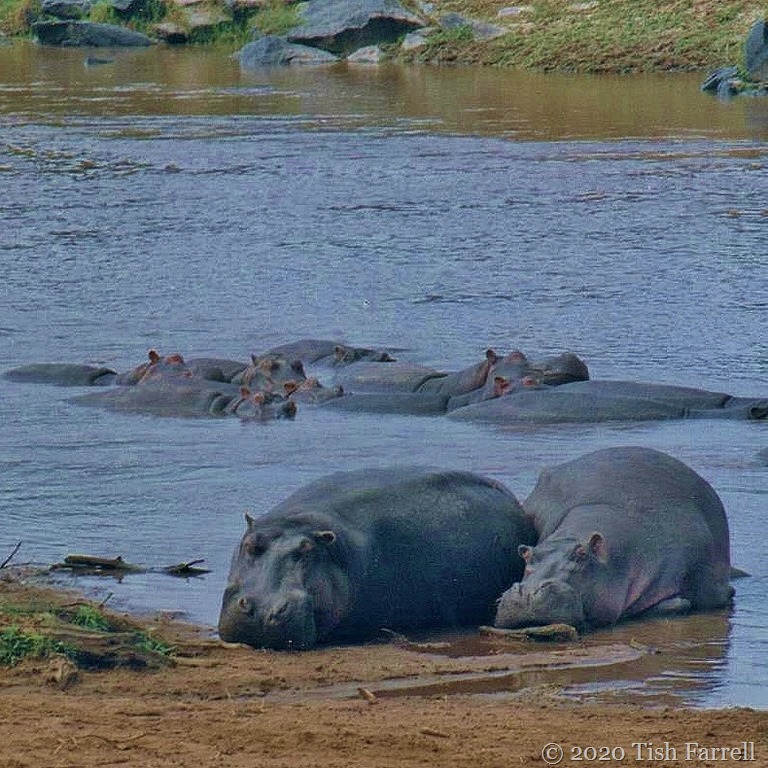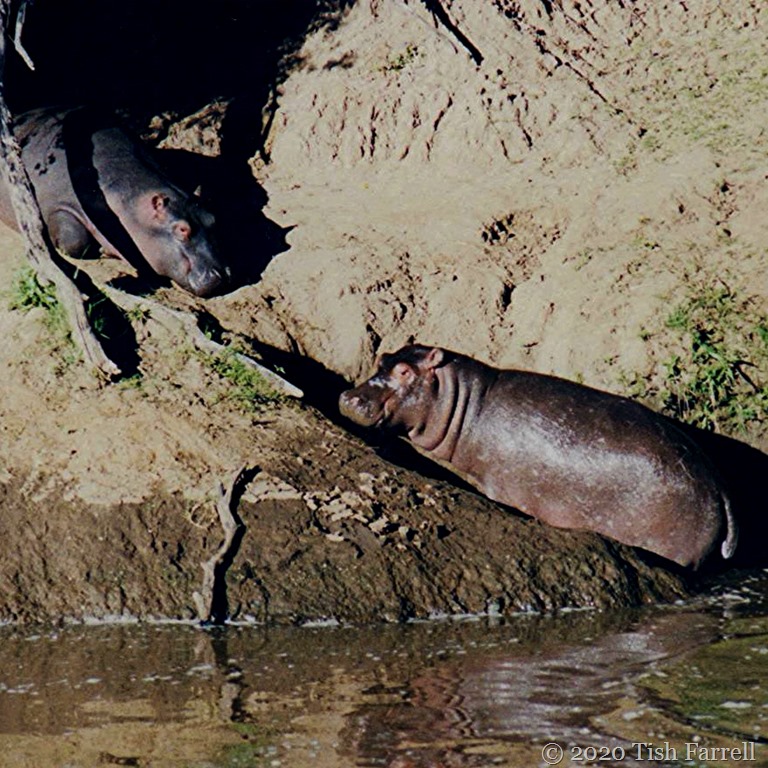 The hippos in the photo were our neighbours at Kenya’s Mara River Camp. Every morning at first light I would watch them emerge from the bush on the bank across from our tent. Full grown hippos weigh anything between three and six thousand pounds so the return to the river, even on custom-made hippo-slides, took some negotiating: head first or bottom first that is the question.