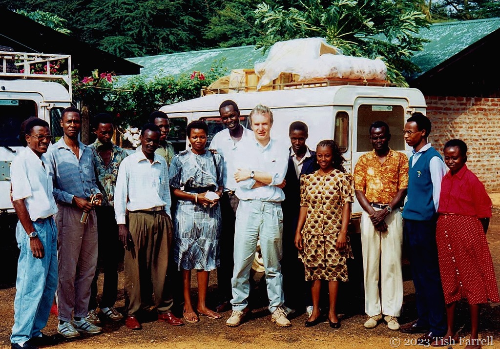 When, at the end of our nomadic nine months, we went to live in Zambia (a very fresh-airy state) I truly missed the scent of fever trees. I couldn’t believe our luck when Graham was posted back to Kenya. It was then he had the rather dismal job of winding up the LGB project at the Kiboko field station. He threw a long, loud party for the lab staff at Hunter’s Lodge, and the next day everyone lined up to have their photo taken.