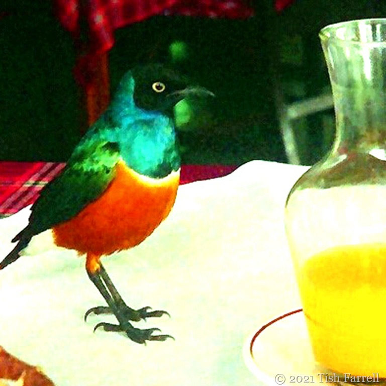 A surreal image – over-exposed so you can see the colours of this Superb Starling, one of Kenya’s commonest birds. But surreal in other ways too. Did we really eat breakfast on the shores of Lake Elmenteita and share it with such birds. (See previous post). On fine days the tables were set out under the fever trees. The soundtrack: incessant chatter of Speke’s weavers from their thorn tree colony by the camp kitchen, fluting call of the black headed oriel, squabbling of babblers, warbling of robin chats, distant grunting of flamingos out on the lake.