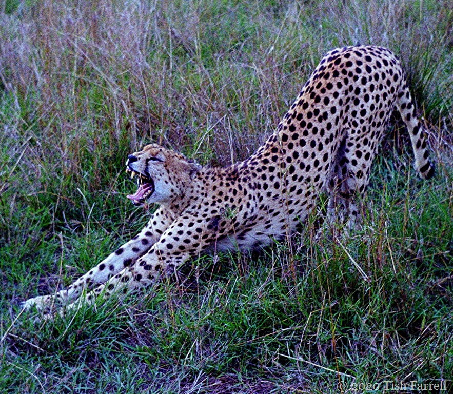 The species is of course famed for its astonishing speed – up to 70 mph (112 kph) at full tilt and with a stride of 23 feet (7 m). Though it’s hard to imagine this particular cheetah has any thoughts of imminent ‘lift off’. She simply lay there, quite ignoring me, while I leaned out of a truck took her picture. Though after a bit she did get up and demonstrate the ‘cat stretch’. Oooh ye-ees. Feel that spinal column flex and lengthen.