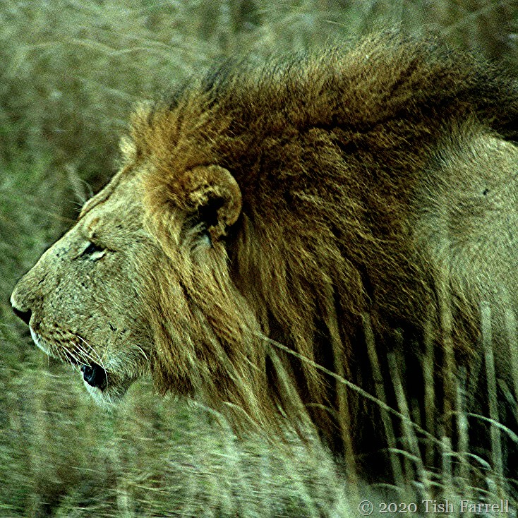 We found ourselves driving through the midst of the Mara’s Marsh Pride at high noon, its members surprisingly active given the usual lion habit of spending the day lying around. They had made a kill, an antelope of some kind, and the ‘under-lions’ were still eating: one very elderly male and three females – while the dominant male prowled the perimeter, exchanging grunt-like roars with another male who was lying in the grass. They seemed quite unconcerned as we stopped to watch, no interruption to the grunt exchange caught here in the photo. Rather puts one in one’s place in the animal scheme of things.