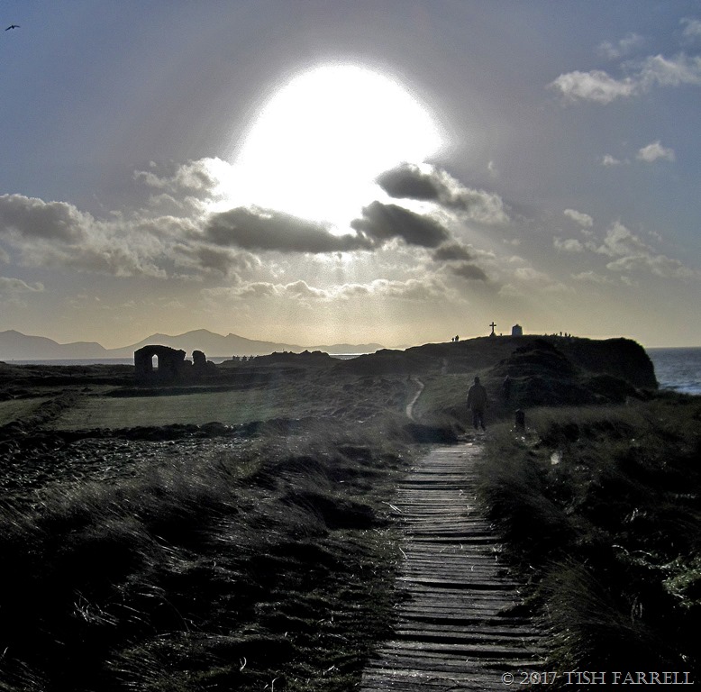Llanddwyn Island on Anglesey is only an island at high tide. Mostly it is a narrow spit reaching out across Llanddwyn Bay to the mountains of the Welsh mainland. It is named after the early 5th century Christian mystic, Dwynwen who, unhappy in love, is said to have retreated to the island, living out her days there alone. Later she became known as the Welsh patron saint of lovers, and in medieval times pilgrims would flock to the island in hopes of divining the faithfulness of their own loves at Dwynwen’s well. In fact so much revenue was raised from the pilgrims’ quest for true love that in the 16th century a substantial chapel was built on what was believed to be Dwynwen’s own place of sanctuary. You see the chapel ruins if you go there today.