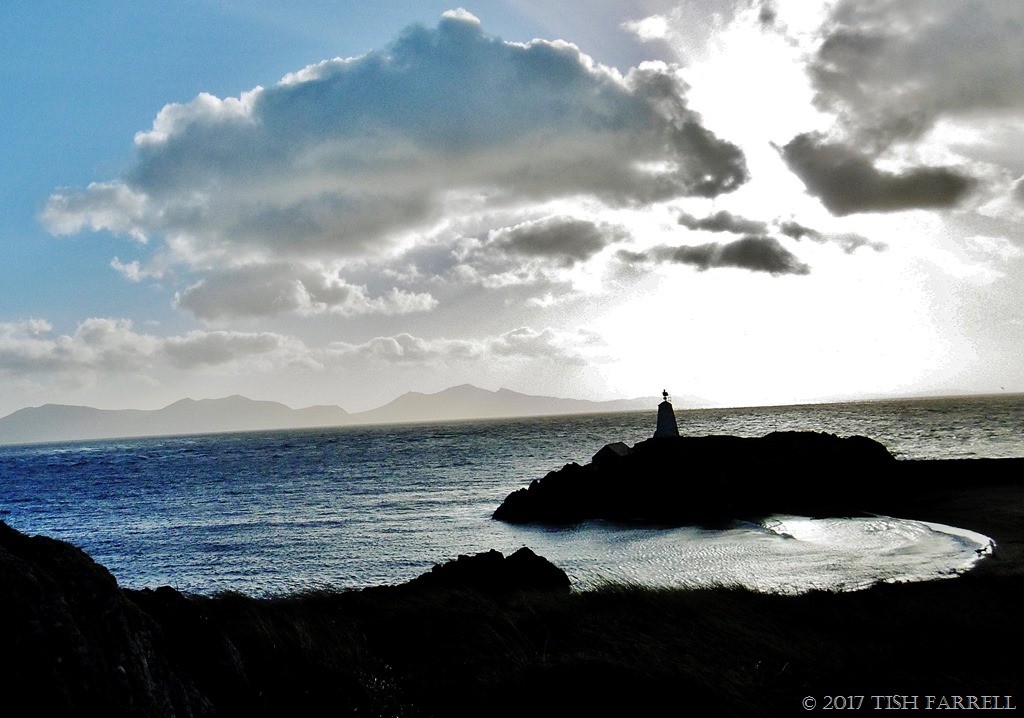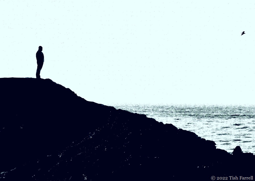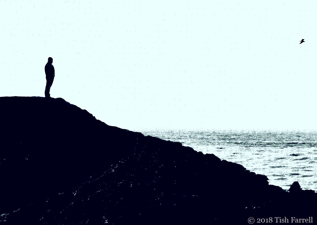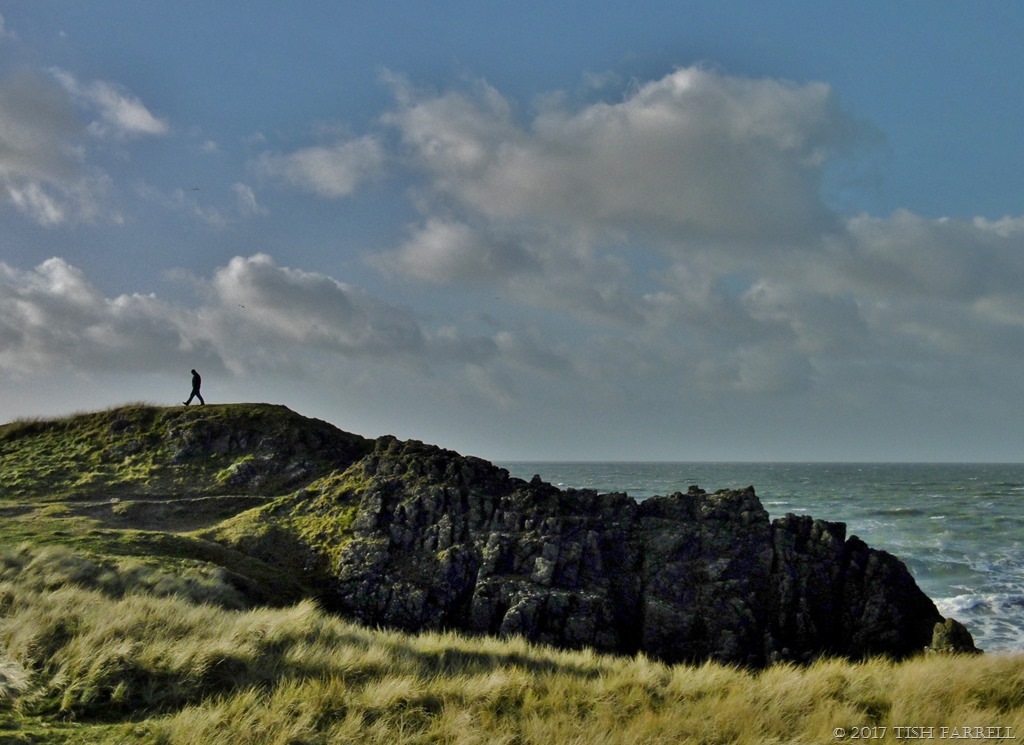 Here’s another view of, and from Llanddwyn Island, taken on our recent trip to Anglesey. It was snapped on high zoom in high wind and thus has pixilation tendencies, much like the snapper, some might say. So I edited it to exaggerate the silhouette effect. I anyway like the stance of this unknown man on the cliff top. He is so well rooted against the gale; so absorbed by the seascape.