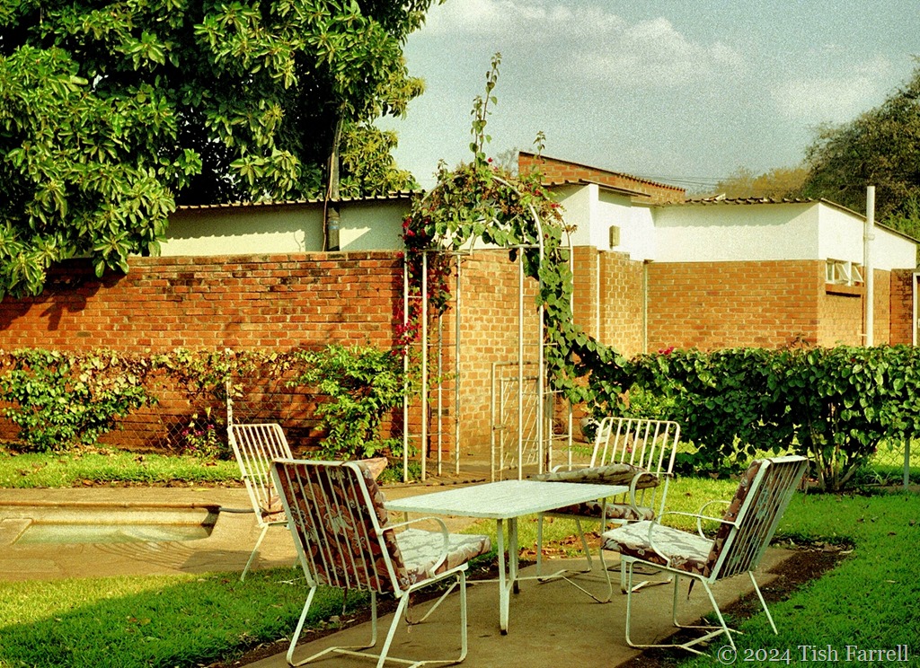 We like our little house. It is red brick, single storey with a sheet iron roof that, during the rains, resounds as if someone is firing bullets into a host of upturned buckets. The living room has French doors opening onto a tiny high-walled garden. There is a big avocado tree in the corner where African sparrows come twittering in to roost in late afternoon. Above the wall, when it is not raining, arcs the blue Zambian sky. To the rear, a small kitchen gives onto a walled back yard and a patch of grass. There are two bedrooms, a tiny study and a bathroom. Outside the front door is a communal garden and terrace – garden seats set by a small swimming pool, a tall palm that rustles endlessly in the high plateau breezes, a sweet scented frangipani tree. No house overlooks any other and there are shady walk ways in between each property.