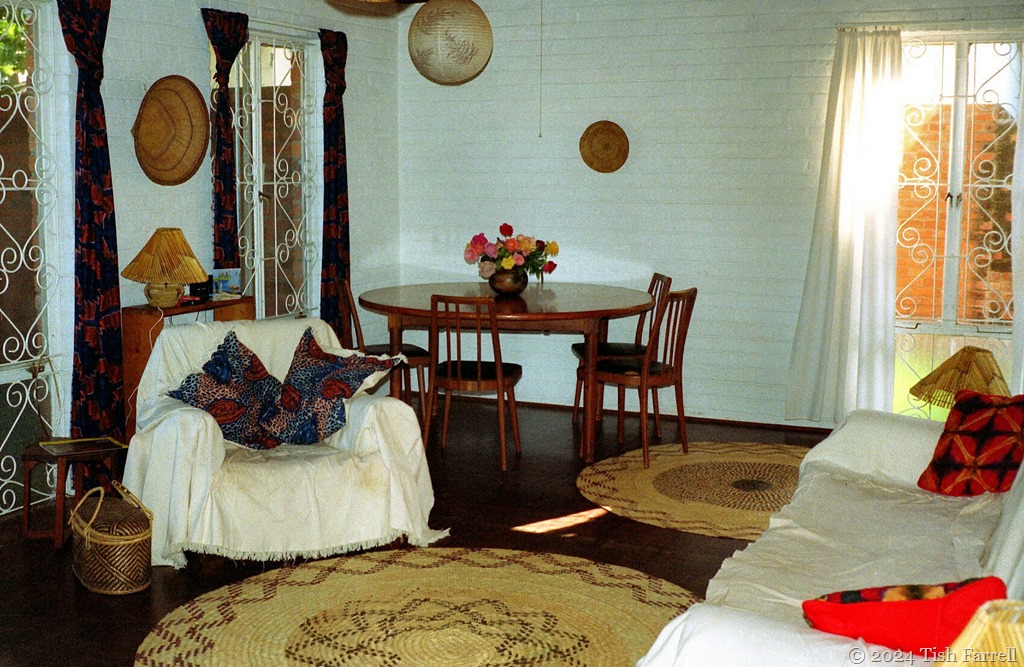 As welcoming committees go, it is well meant but too much, and I wonder if I’m responding sensibly. They turn out to be G’s fellow consultants from the Natural Resources Institute in Chatham, Kent, out on short-term missions relating to crop storage and food security. They include G’s head of section, the man who seconded him to the E.U. Delegation. He’s just off to Zimbabwe, and hardly have we reached our room than the phone rings, and G is summoned to an impromptu meeting and a trip round a Lusaka grain store that has flooded, none of which has anything to do with his present posting. He goes off looking terrible while I collapse on the bed, trying to come to terms with my new surroundings.