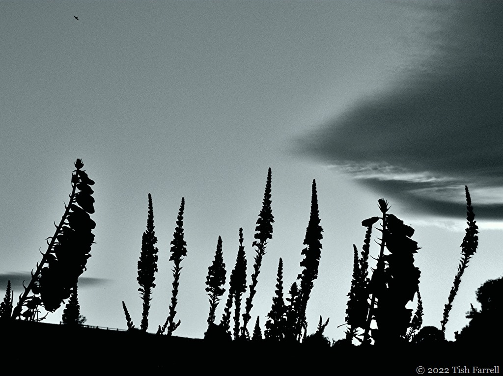 Next, a former back garden view of foxgloves: sun setting over the fence…