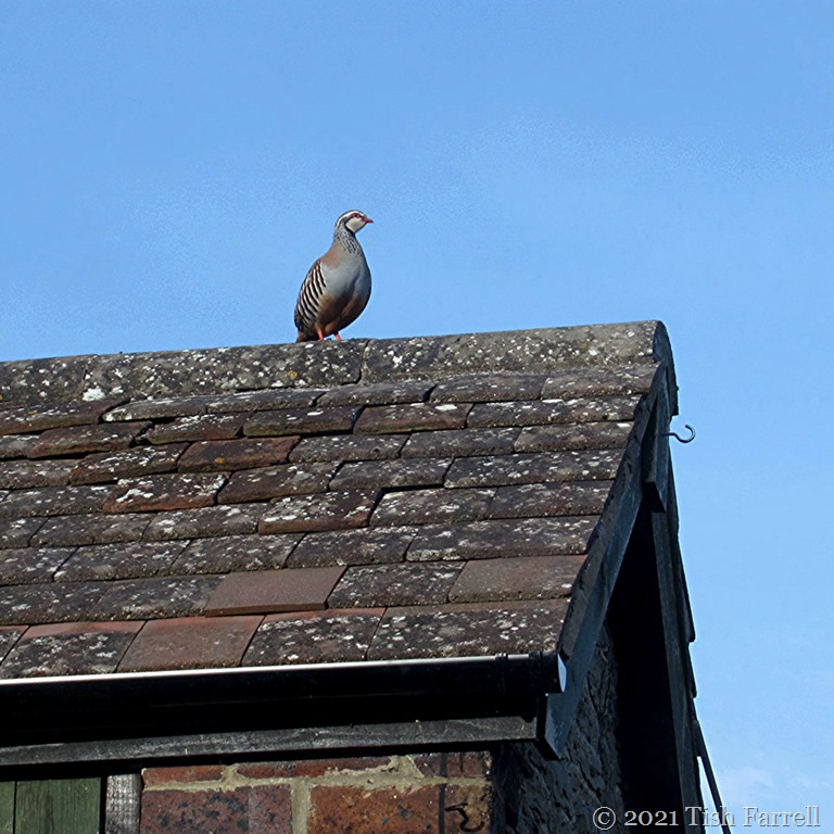 I have no idea why this red-legged partridge decided to visit the Farrell domain. I don’t believe I have ever seen a sign of one around Wenlock’s field margins, although it ought to be ideal territory. They apparently like open farm terrain and feed on seeds, roots and small invertebrates. Also when disturbed they prefer to run rather than fly.