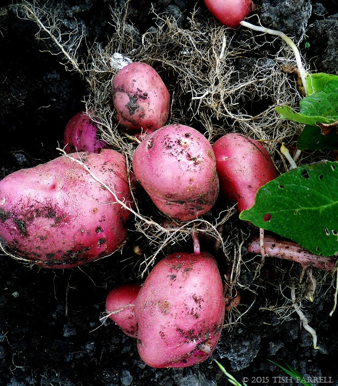 But now here is the close up shot I really wanted to show you, and the reason why I was headed  for the allotment: my first main crop potatoes just released from the earth. These are Desirée, organically grown and most desirable, not only for looks and flavour, but for general resistance to drought, bugs and slugs: