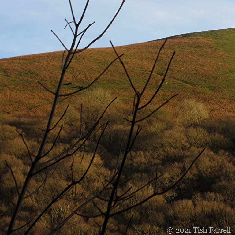 The close-up above was a very ‘long shot’, but I like the way the sun glints off the bare branches of the dark wood; the layers of russet leaves and bracken and the deeper soily looking browns among the ash trees. It could well be a candidate for Jabberwocky’s tulgey wood. It also reminds me of one of those ‘heavy’ Victorian oil paintings – Arcadia seemingly overdone with every expectation of rustic maids and shepherds popping up. But here it is. No time-slipped lads and lasses, just a piece of real Shropshire landscape.